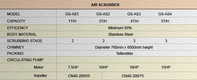 The GS-AS Air Scrubber is one of our unique equipment developed through many years of research and improvements, its efficiency has been proven by various independent surveys. It is used very successfully in many factories worldwide for washing off the rubber dryer exhaust impurities and to eliminate the bad smell resulting from rubber drying.