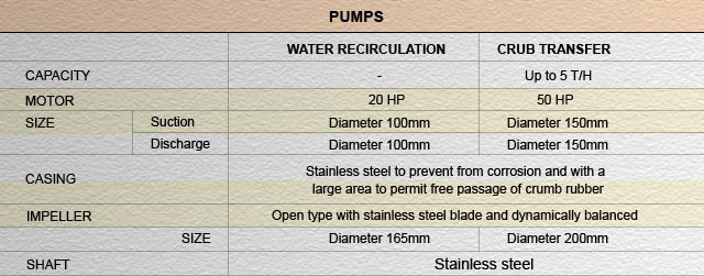 The water circulation pump is designed as a jetting pump. It delivers water at high pressure to spray as to push the rubber crumbs or granules around the blending tank with minimum agitation to the dirt or bark shavings that have settled to the bottom of the tank.Crumb PumpThe crumb transfer pump is specially designed for the hydraulic transfer of the rubber granules to the vibrating screen of the filling station. It is non-clogging and features a set of stainless steel impeller in a thick gauge of stainless steel housing.
