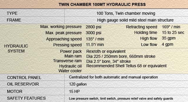 This 100 MT twin moving chamber Automatic Rubber Baling Press is specially designed for efficient automatic baling of crumb rubber into bales form of 33.5kg or 35kg per bale. A special feature of this 100 MT Press is its twin moving chamber, which moves horizontally from one end to another during the operational cycle. While one chamber is being pressed, the other empty chamber will be loaded. The structural frame of this press is made of strong welded steel structures which enable the machine to be installed directly on a flat concrete surface without necessity of costly civil works pit foundation. The operation of this press is fully automatic by pressing the push buttons installed in the control panel console. It can also be operated manually when required by means of extra ancillary selector switch.